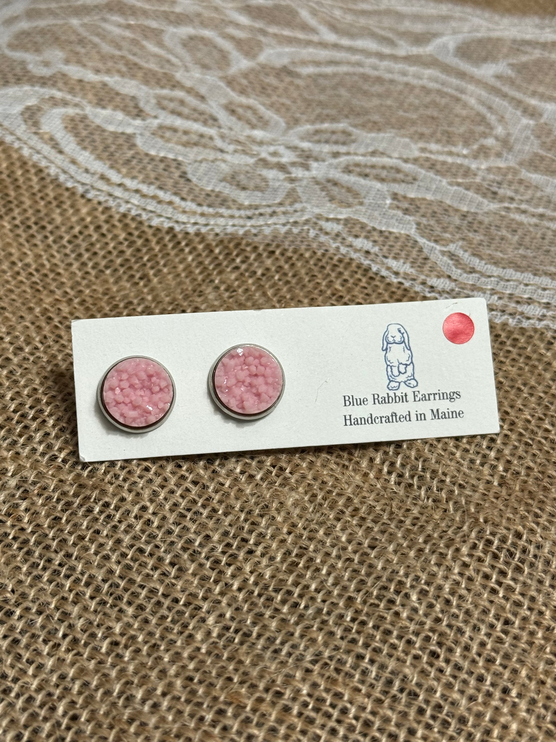 12mm lite pink chunky faux druzy studs. Stainless steel findings.