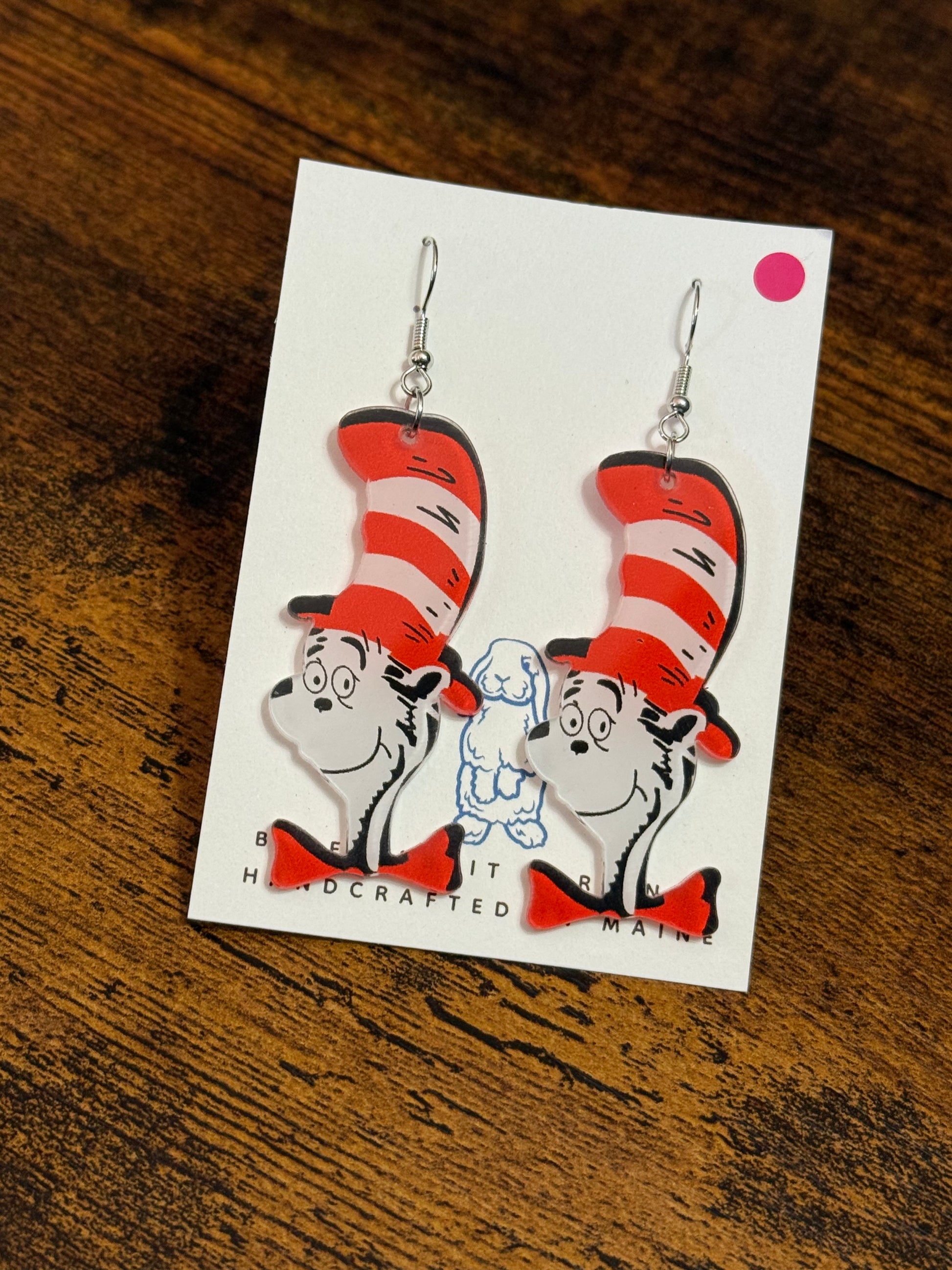 Acrylic cat in the hat inspired earrings. Stainless steel findings.