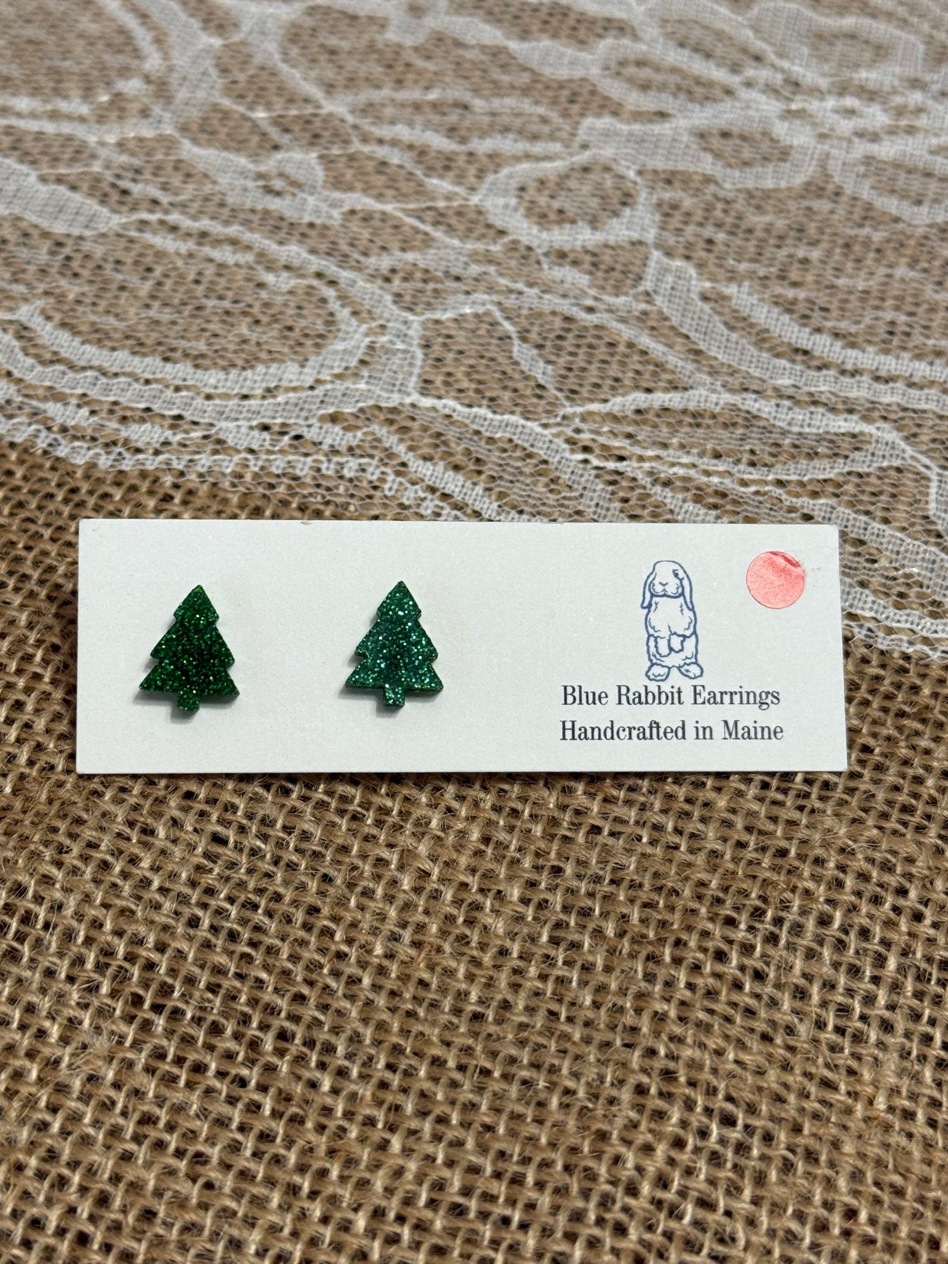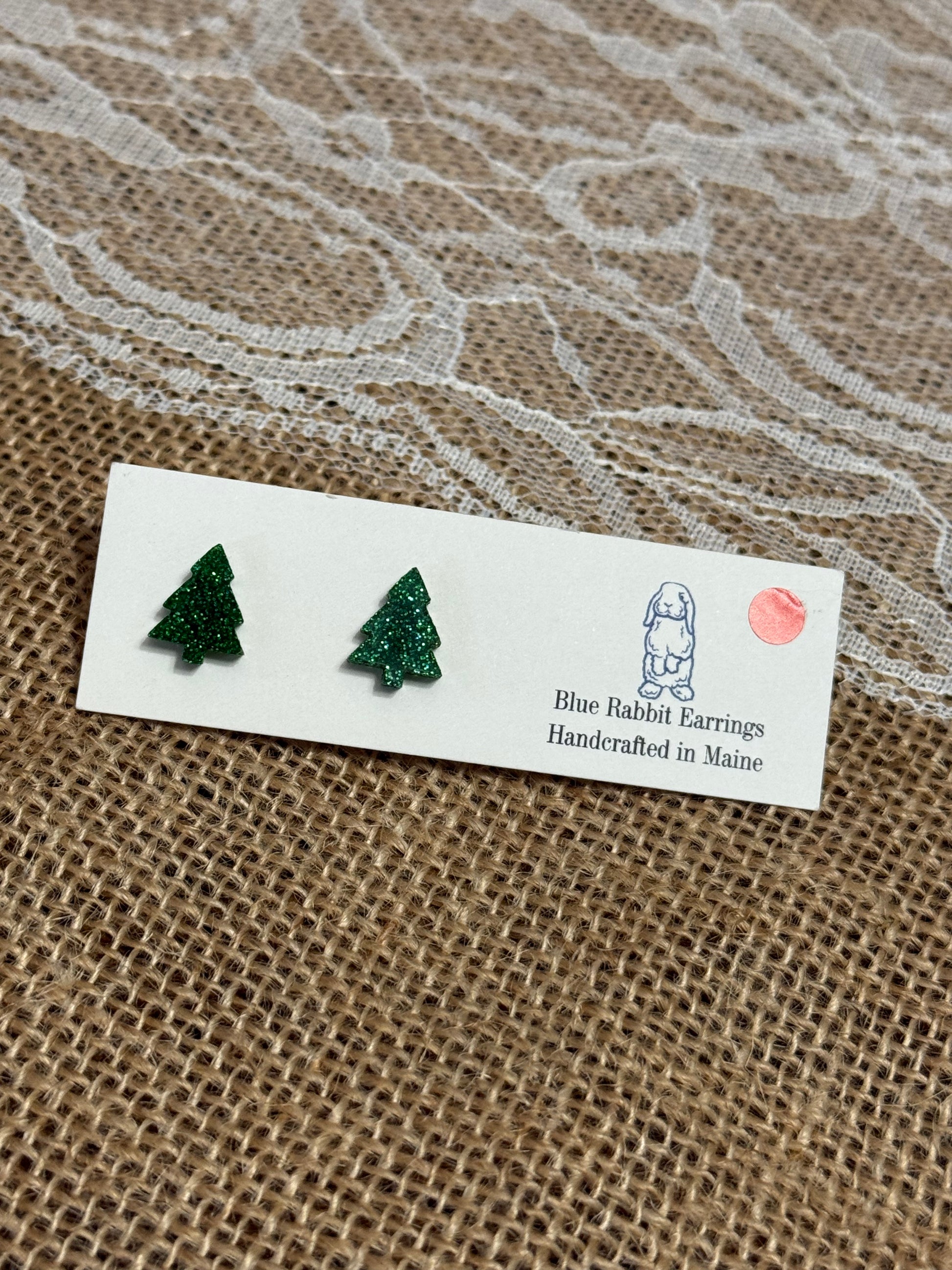 Acrylic green glitter tree studs. Stainless steel posts.