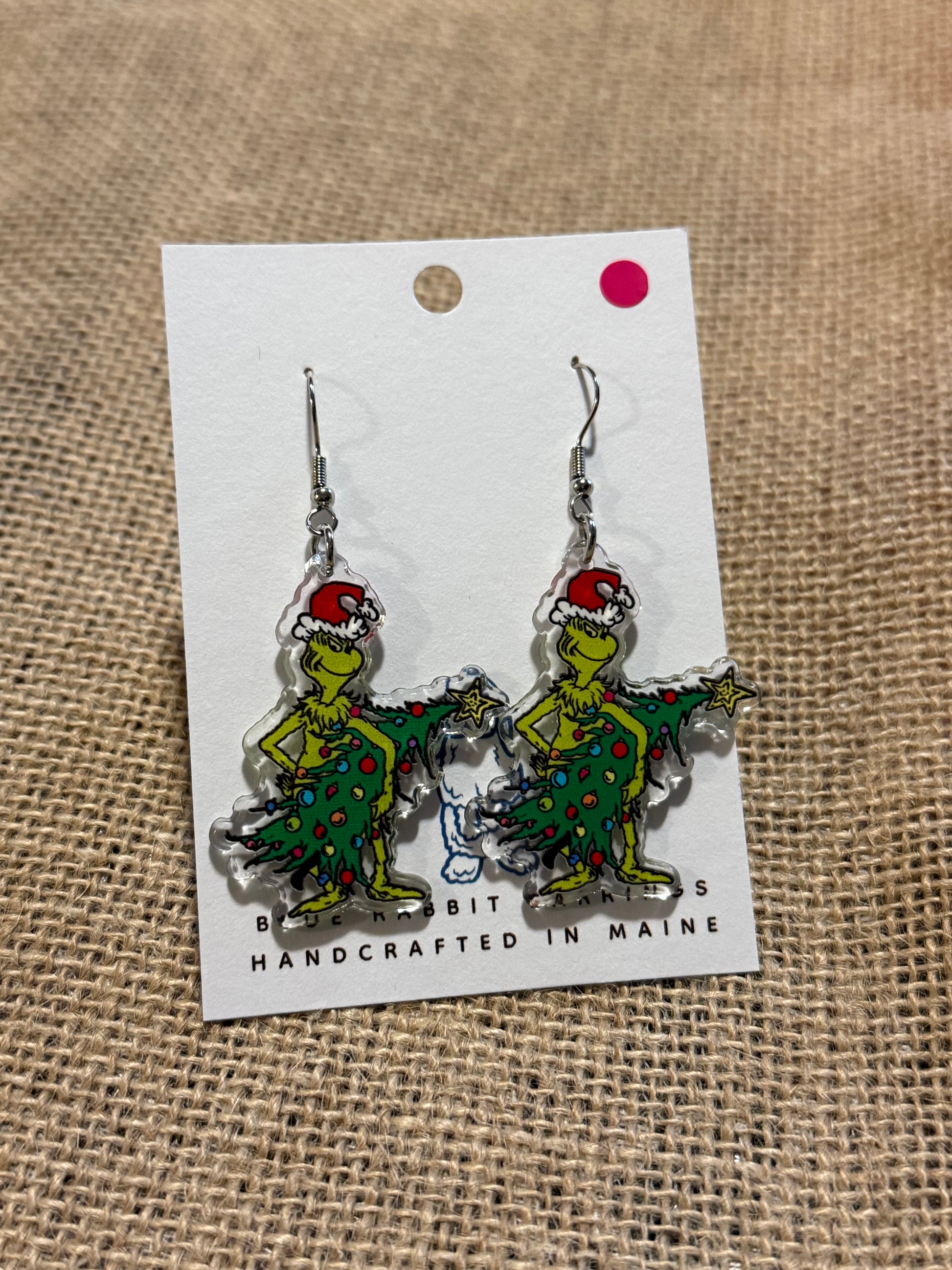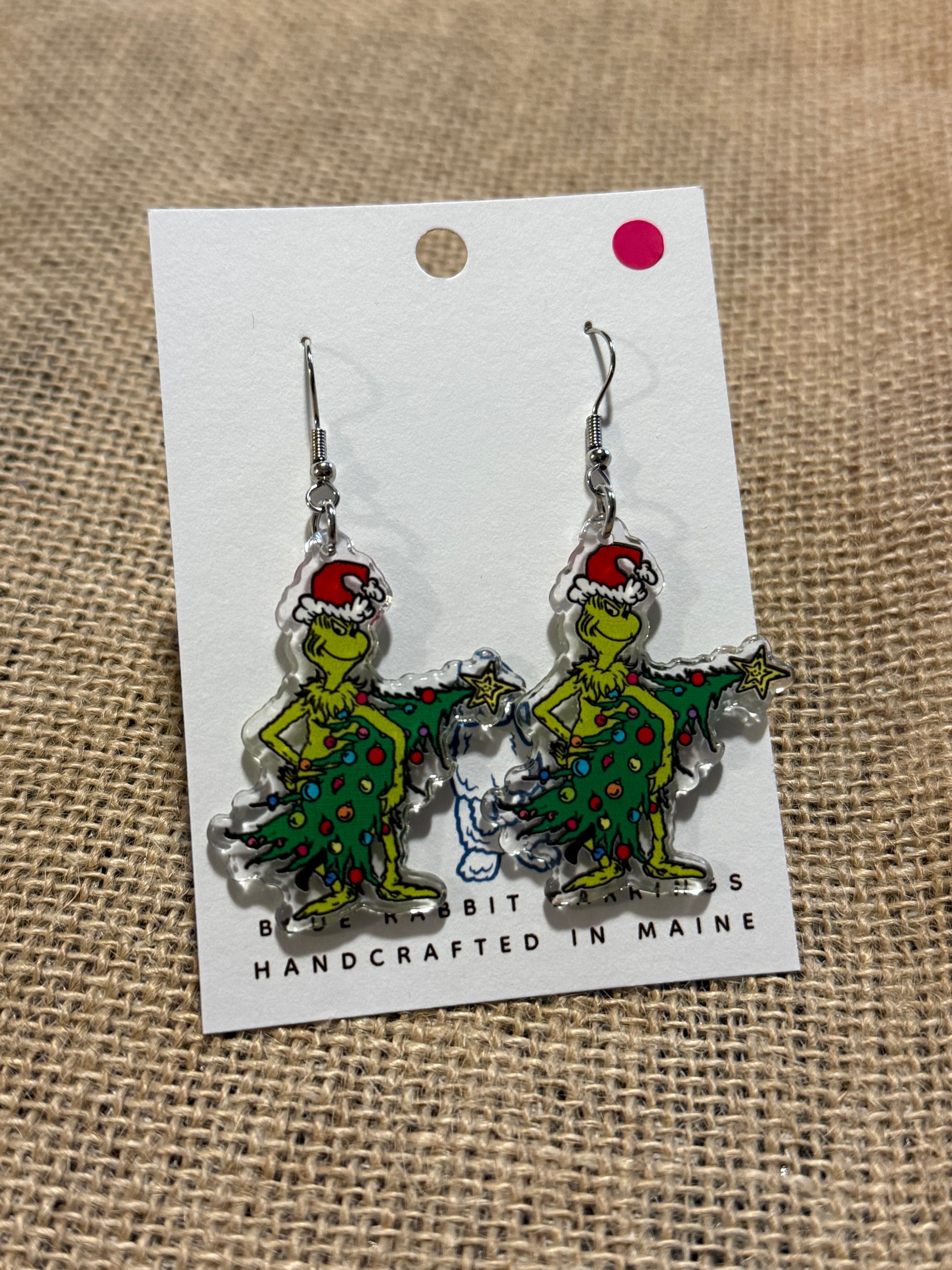 Acrylic Grinch & Christmas tree earrings. Stainless steel findings.