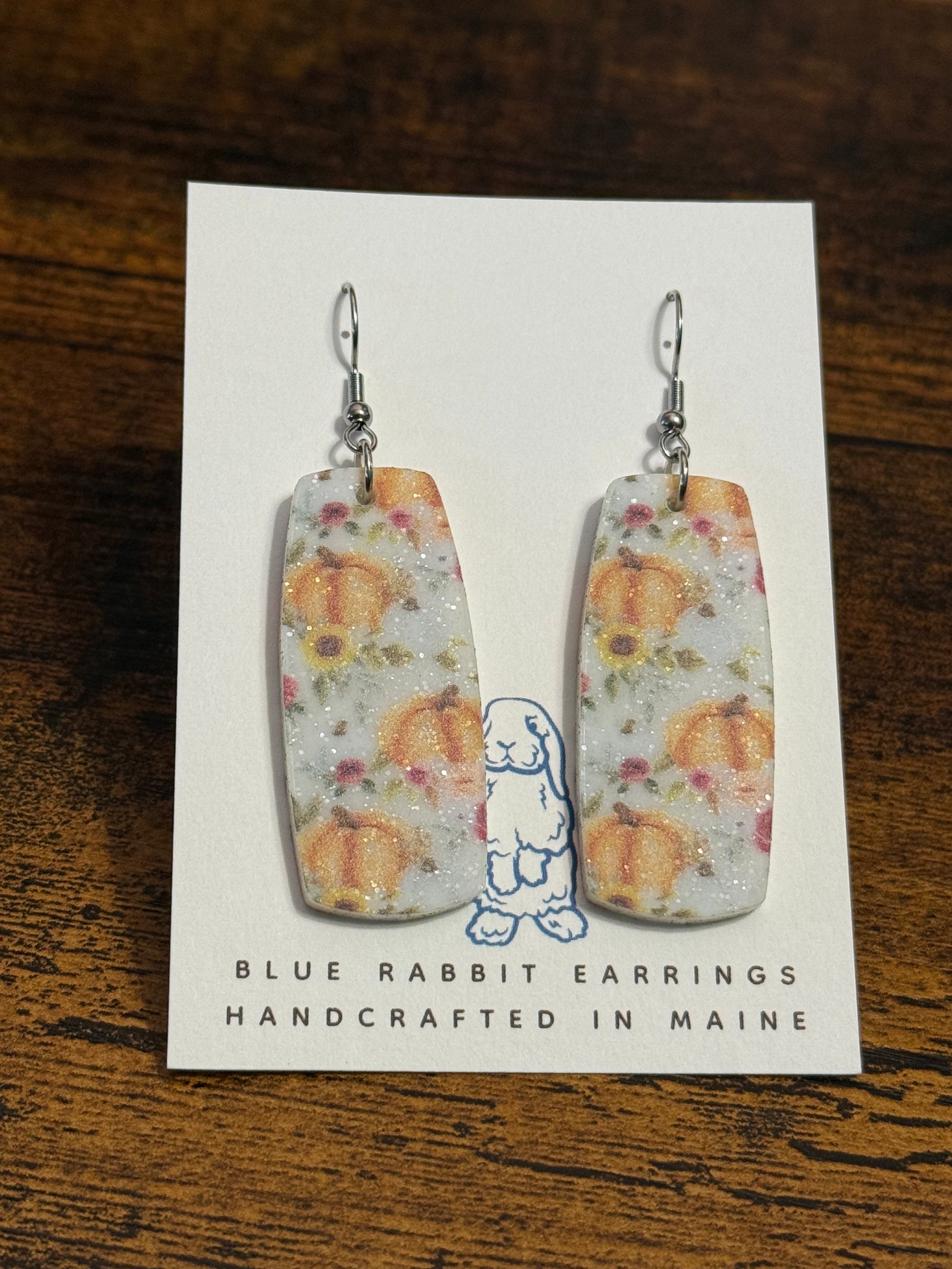 Acrylic bar shaped earrings featuring a pumpkin and flower design with a subtle glitter touch. Stainless steel findings.