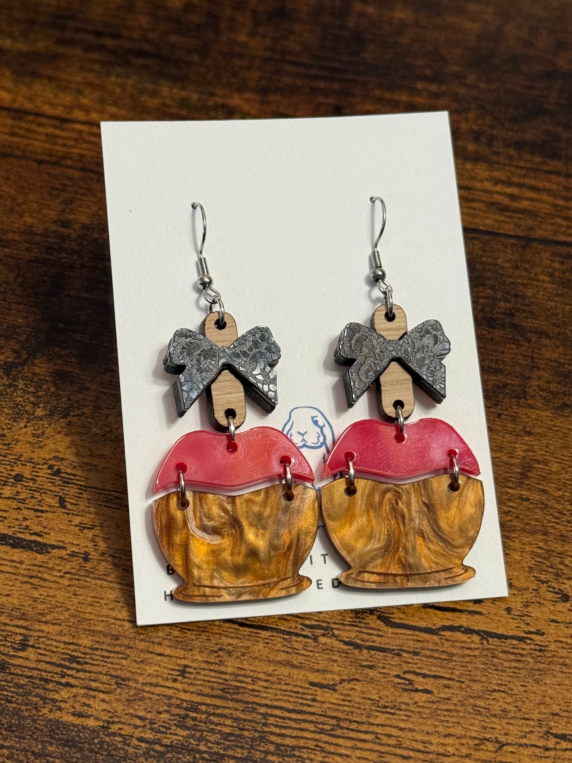 Acrylic red apple and caramel earrings. Featuring an acrylic bow and wooden stick. Stainless steel findings.