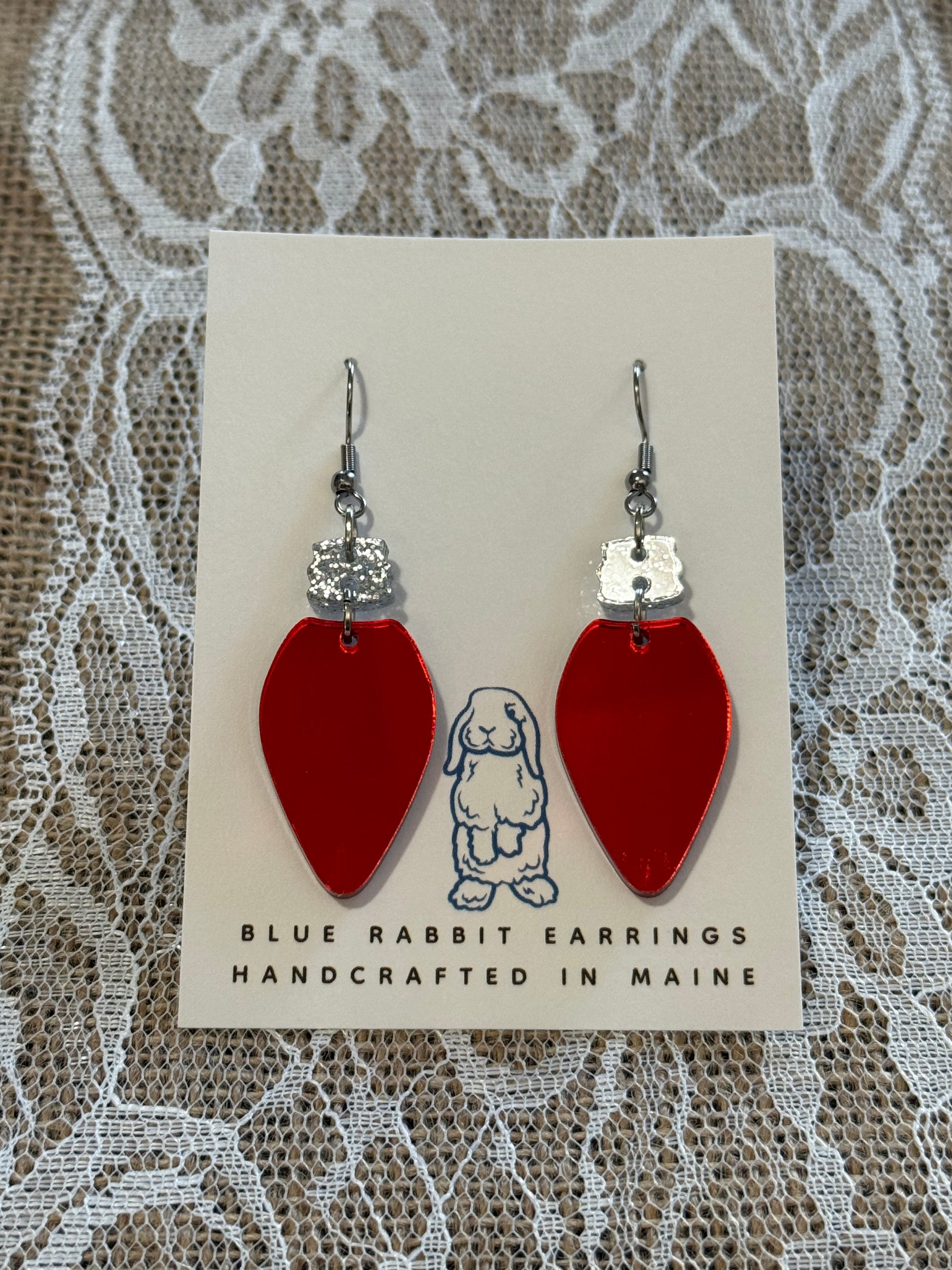 Acrylic bright red mirrored acrylic Christmas bulbs with silver glitter connectors. Stainless steel findings.