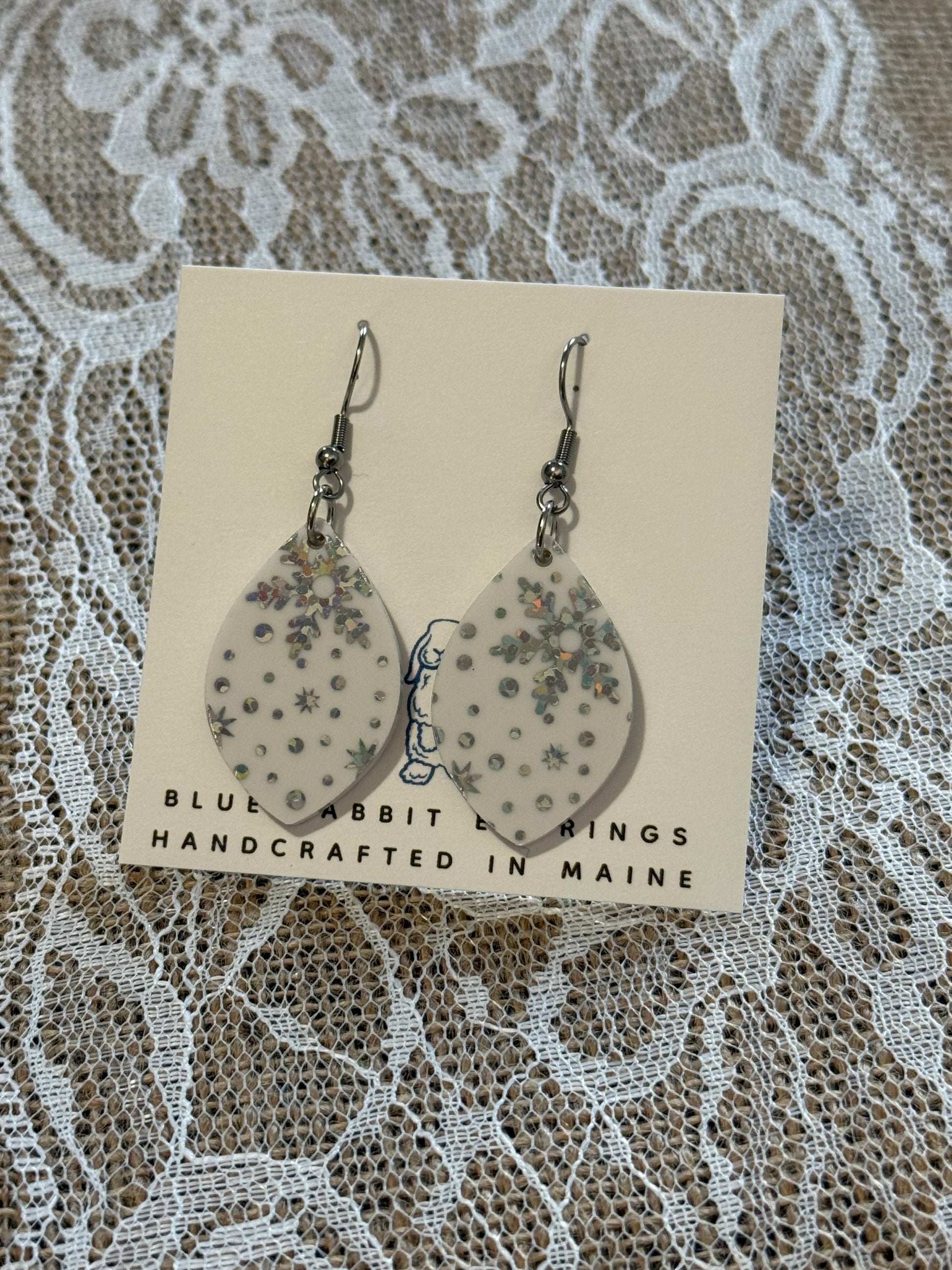 Acrylic small pear shaped holographic snowflake earrings. Stainless steel findings.