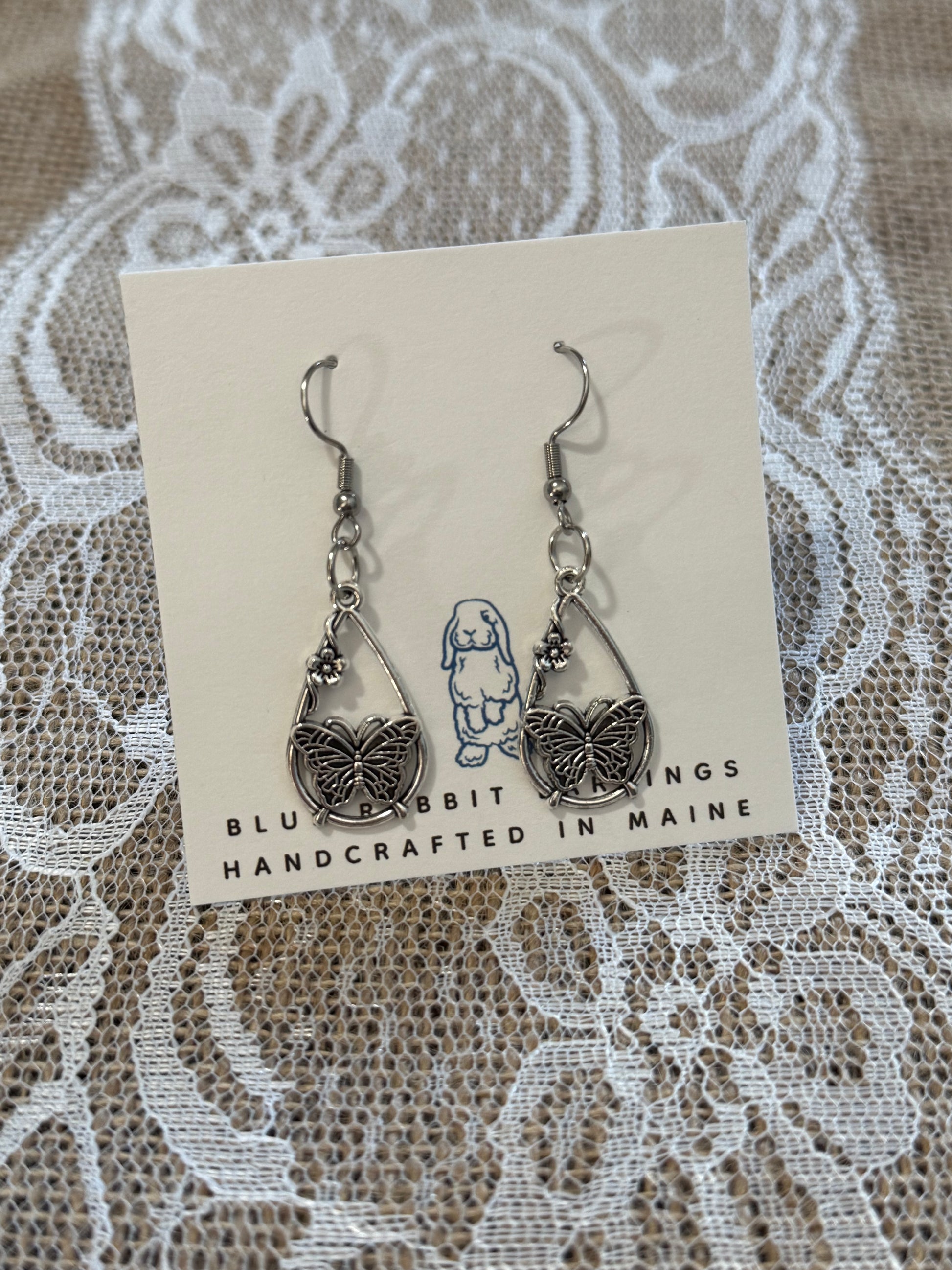 Silver finish butterfly teardrop pendant earrings. Stainless steel findings.