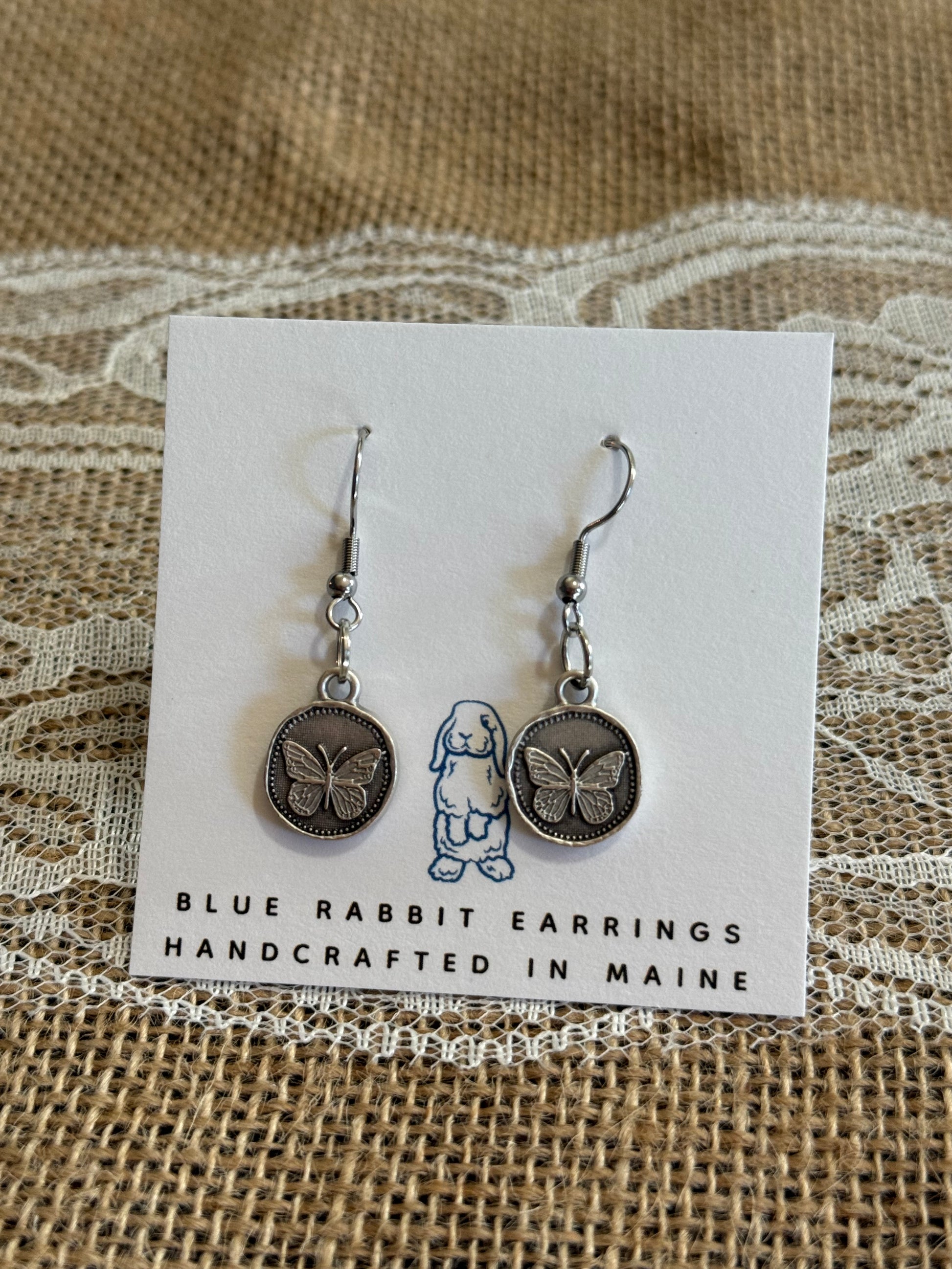 Antique silver Butterfly pendant earrings. Stainless steel findings.